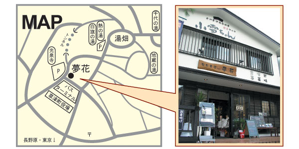草津温泉 夢花 〒377−1711 群馬県吾妻郡草津町大字草津39−1 TEL・FAX:0279−88−0224 営業時間:10:00〜15:30 17:30〜21:15